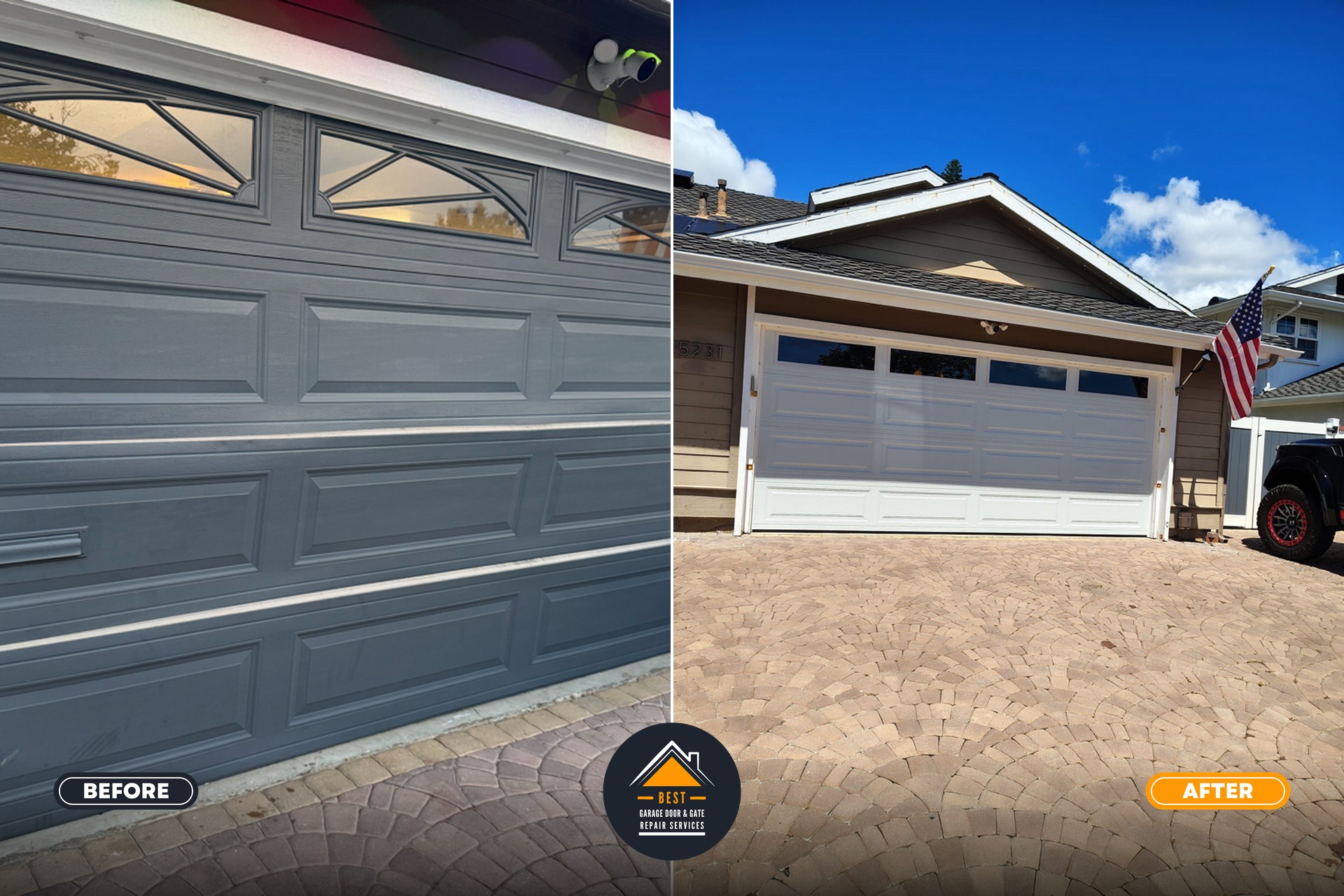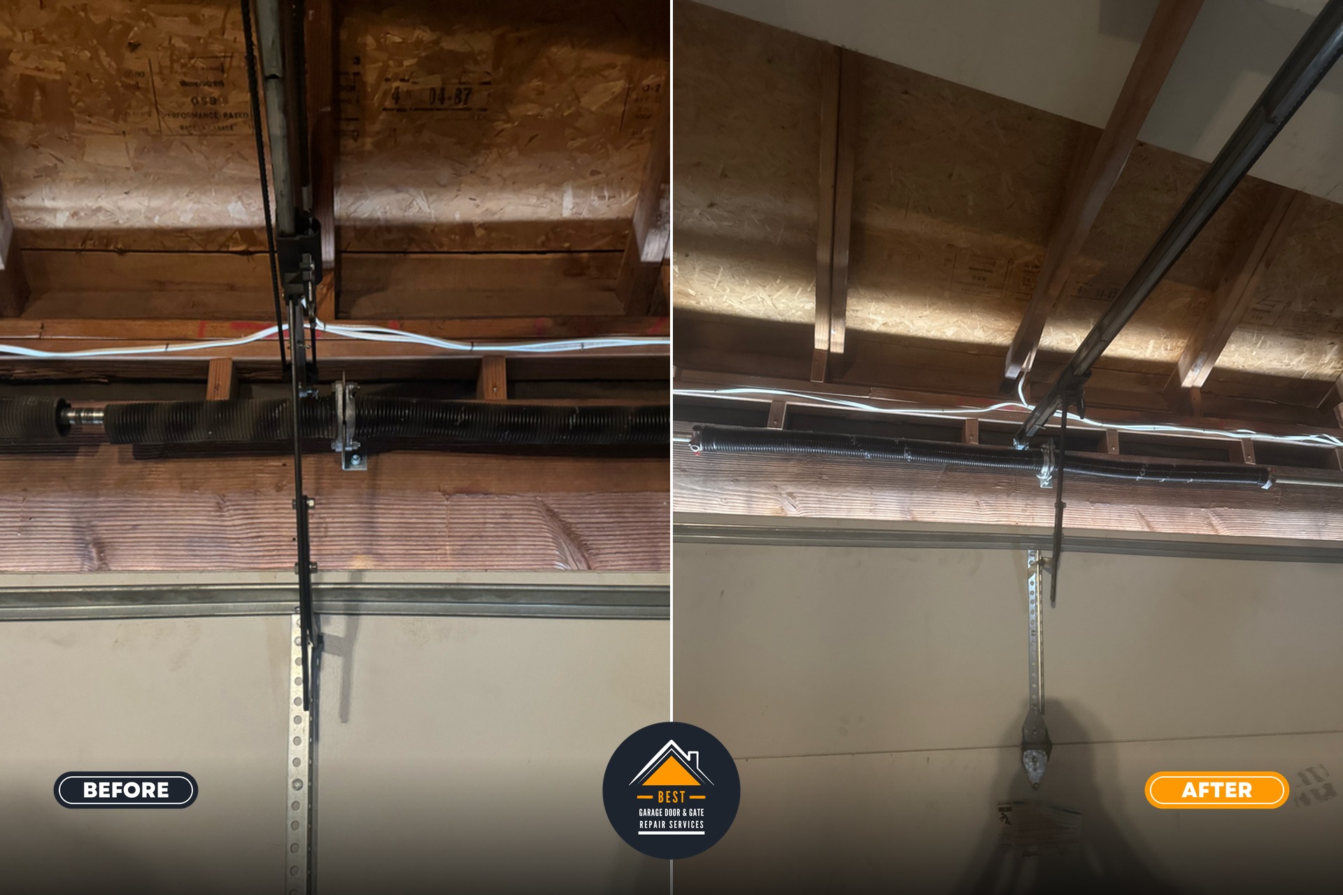 The “Before” and “After” images highlight the significant upgrade, showcasing a safer and more reliable garage door mechanism.